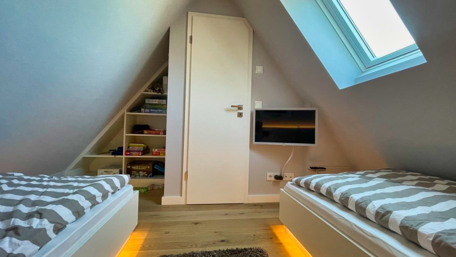 Betten: 1 Doppelbett (180 x 200 cm), 2 Kinderbetten (jeweils 100 x 200 cm)